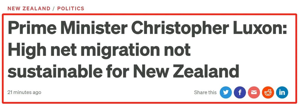 新西兰总理Christopher Luxon接受采访时表示,新西兰一年11.8万的净移民数量不可持续。 https://t.co/MMKr8anTfW
