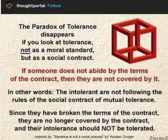 Seems more relevant now than ever in our lifetimes. However, the state has a monopoly on violence, incarceration, and most other forms of social control, including the determination of what, exactly, should be defined as intolerance. Consequently, forms of intolerance that support the interests of the state are permitted, and even encouraged, while forms of dissent that oppose the interests of the state can be deemed unacceptable intolerance and be punished. For example, many Western states have determined that intolerance of Palestinians and pro-Palestinian demonstrators is acceptable intolerance, while deeming criticism of Israel and Zionism to be forms of intolerance that will not be tolerated, punishable by being fired from your job, expelled from your university, prevented from flying abroad, pepper-sprayed and beaten by the police, and jailed.