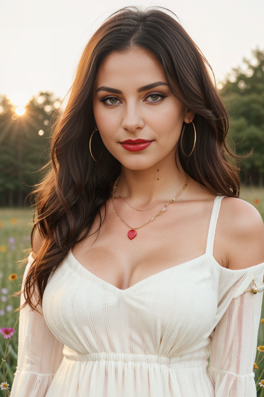 Prompt: “f/2.8, 50mm, 85mm, sharp”, standing in a field of wildflowers with the sun setting behind her”, by alyssa monks”