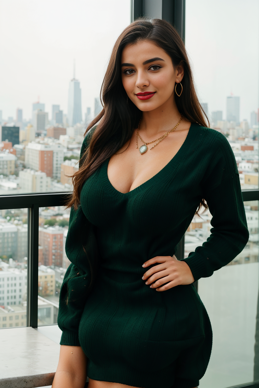 Prompt: “35 mm, 8k, F/2.8, statement piece of jewelry, standing in front of a large window with a cityscape view”, by Filip Hodas”