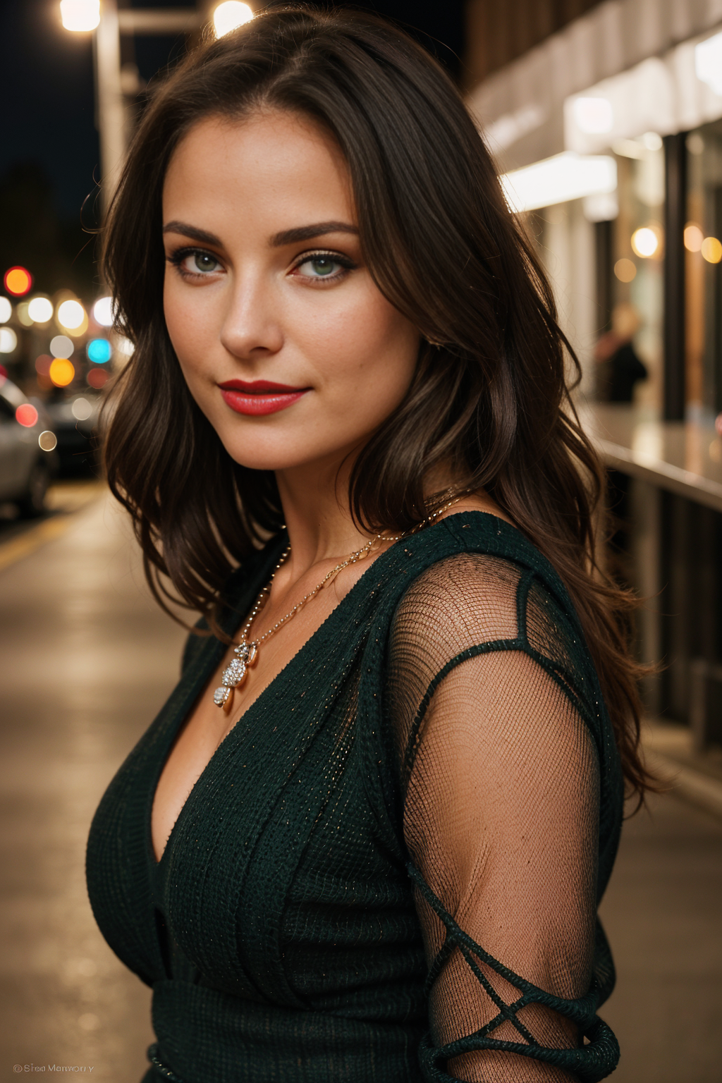 Prompt: “84mm”, 85mm, F/2.8, she is swedish and wears a tight black dress, brown hair, by Steve McCurry”