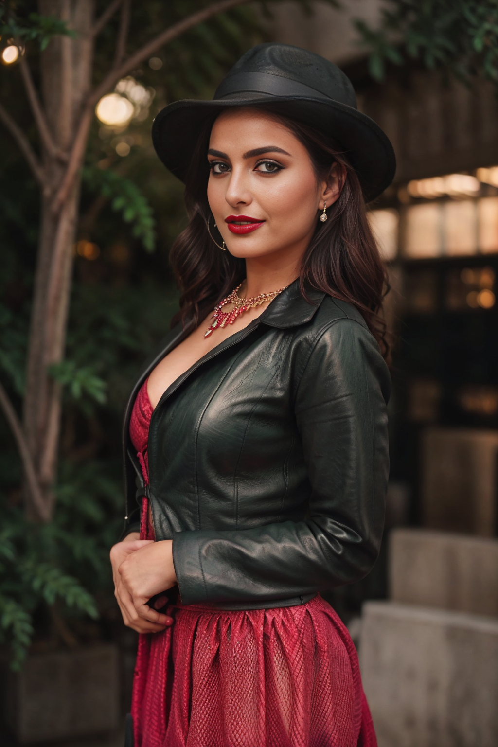 Prompt: “f1.8, 35mm, F/2.8, wearing a black leather jacket and a fedora, busy background, by David LaChapelle”