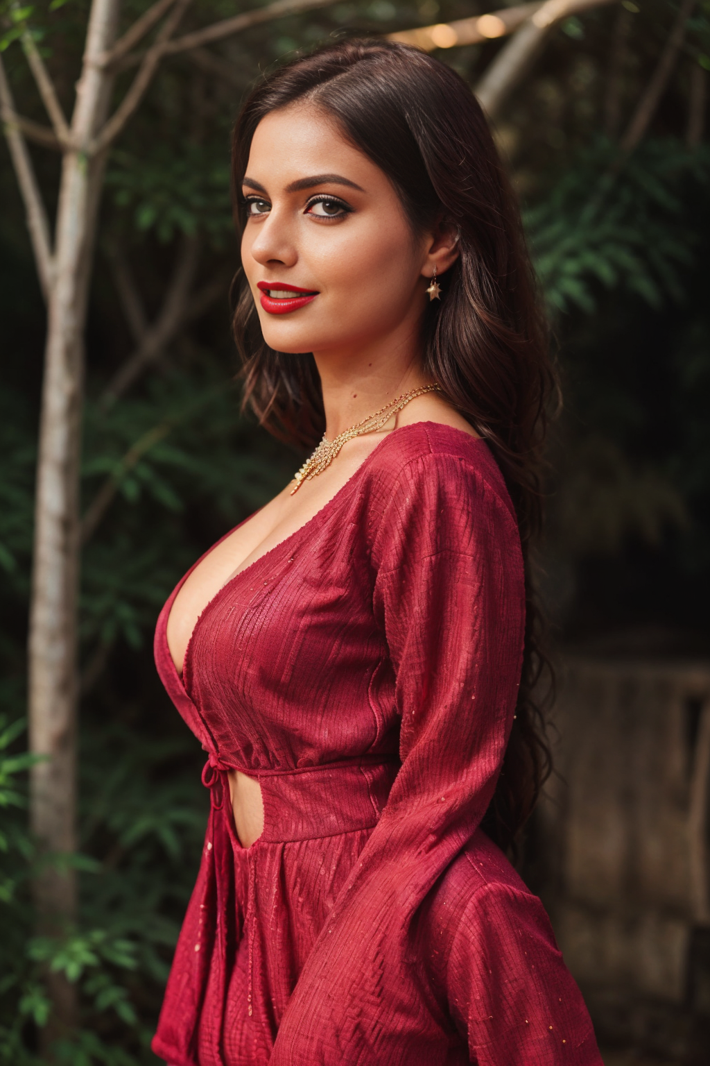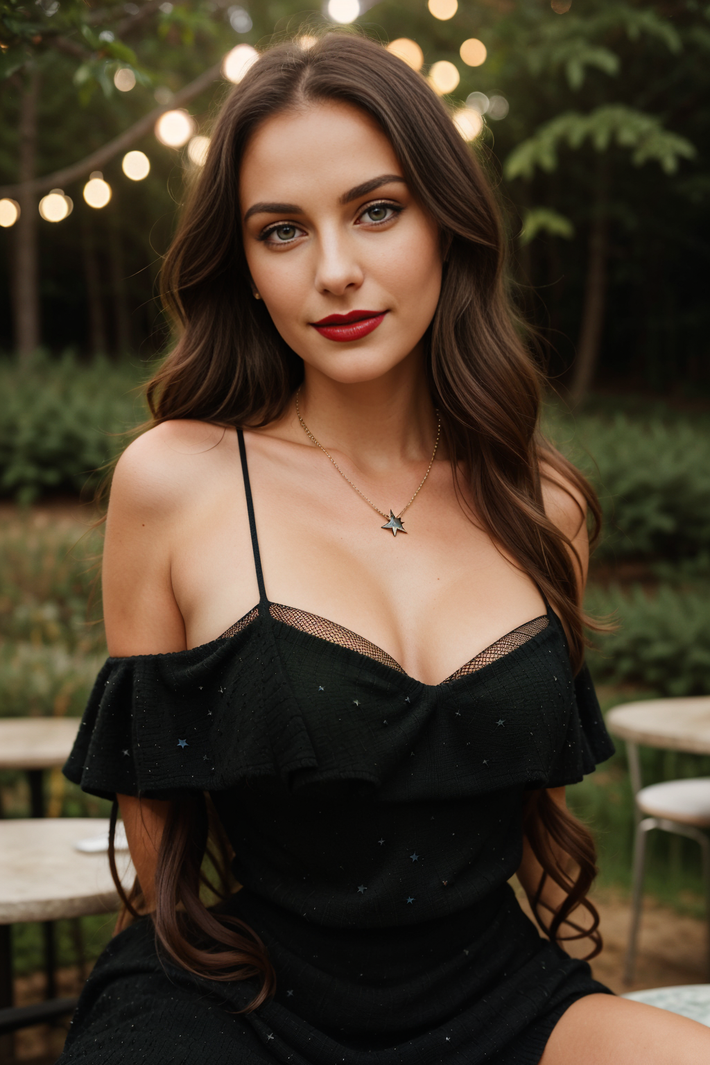 Prompt: “4k”, 85mm, 84mm, flowy dress, with the background featuring a starry night sky and a forest”, by David LaChapelle”