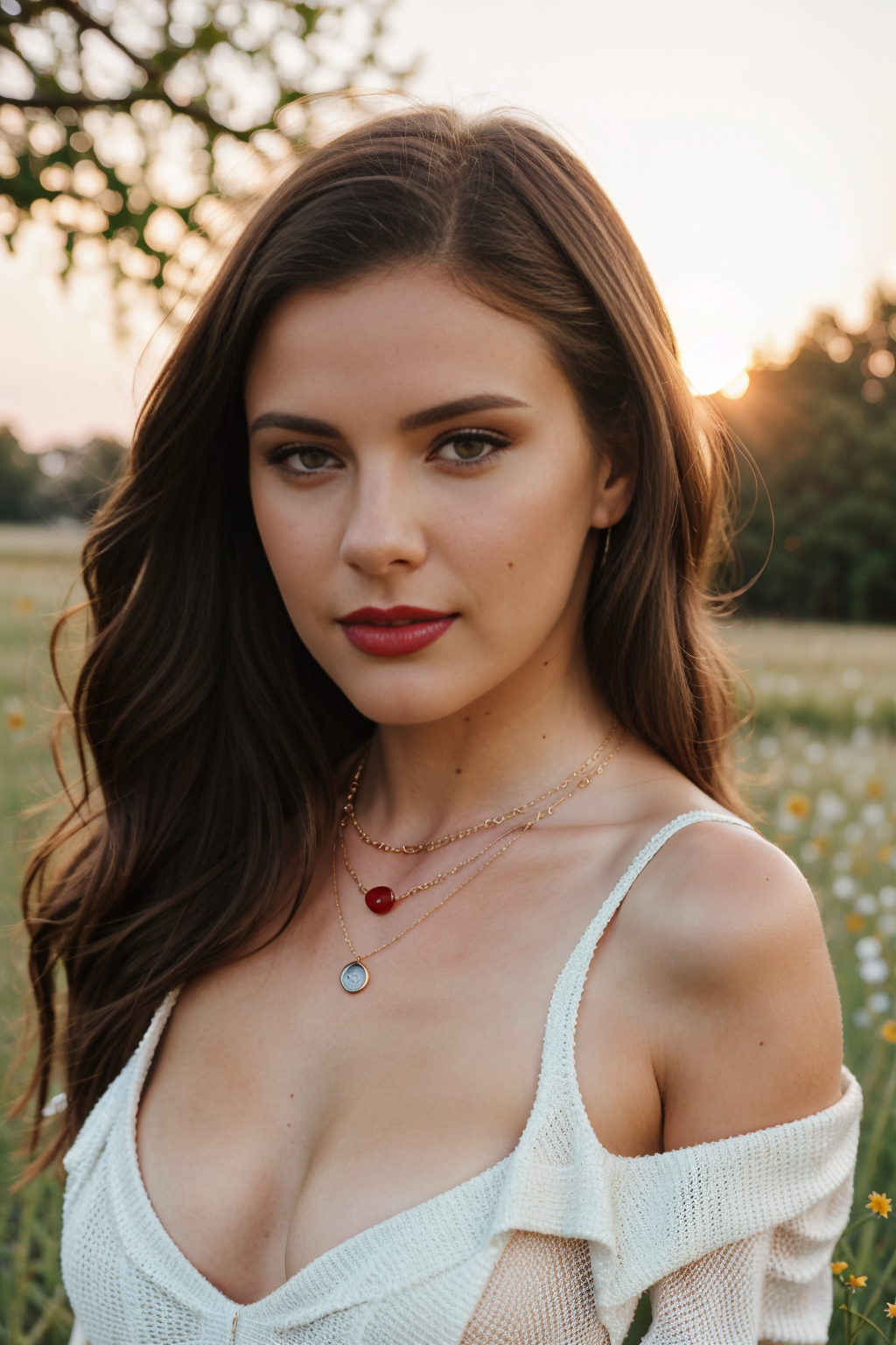 Prompt: “50mm portrait photography, 24mm, 4k, standing in a field of wildflowers with the sun setting behind her”, sophisticated, by alyssa monks”
