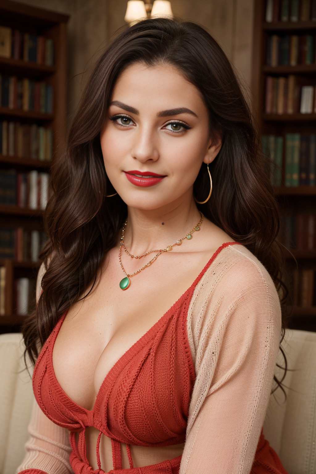 Prompt: “1/1250sec at f/2.8, 84mm, 4k, the background should feature a library or living room setting with bookshelves and antique furniture”, flowy dress, by David LaChapelle”