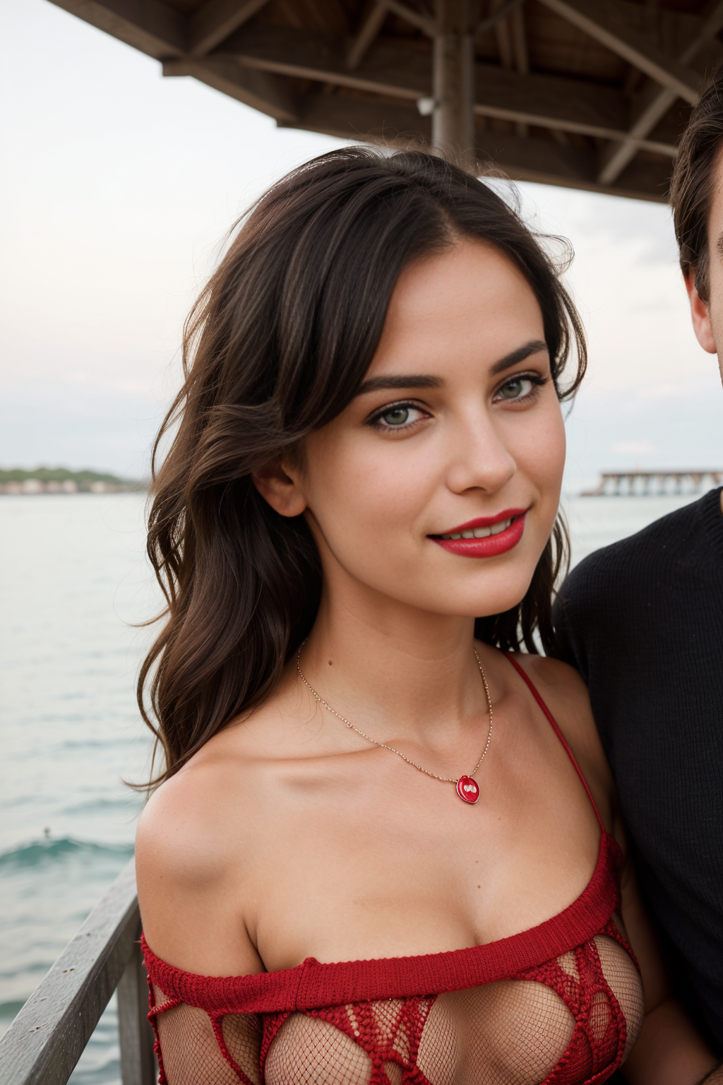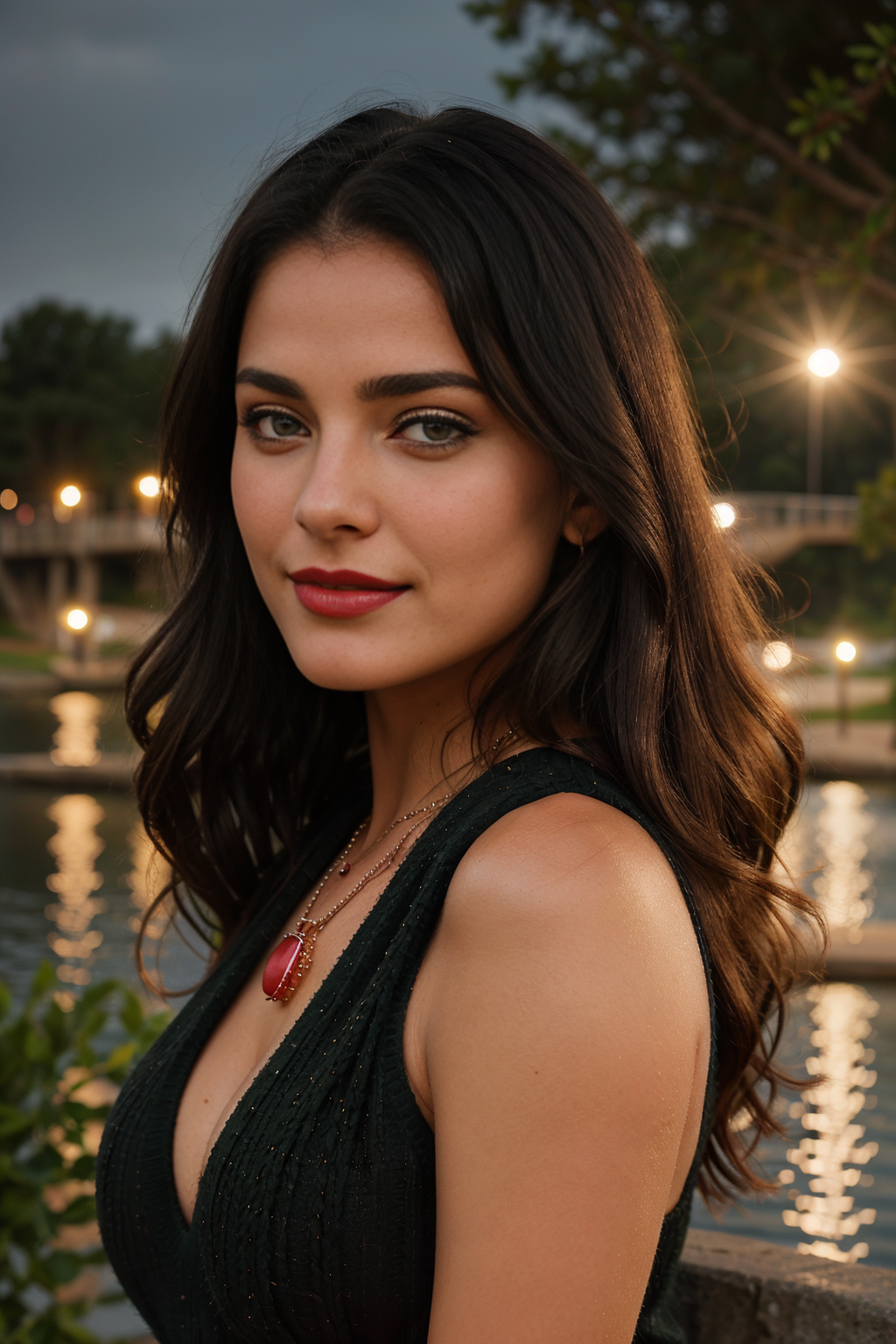 Prompt: “she is 18, 4k, 35mm, press, with the background featuring a lake and a bridge”, by Steve McCurry”