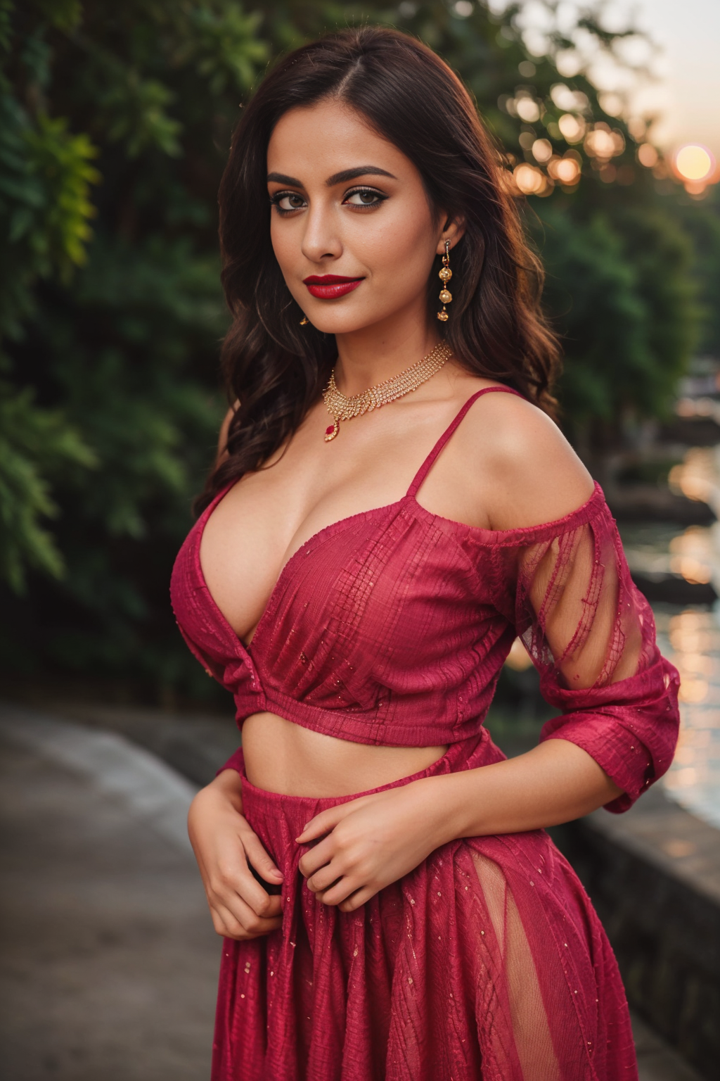 Prompt: “f/2.8, 24mm, 8k, off-the-shoulder dress and a single, with the background featuring a sunset and a body of water”, by caravaggiom award winning photo”