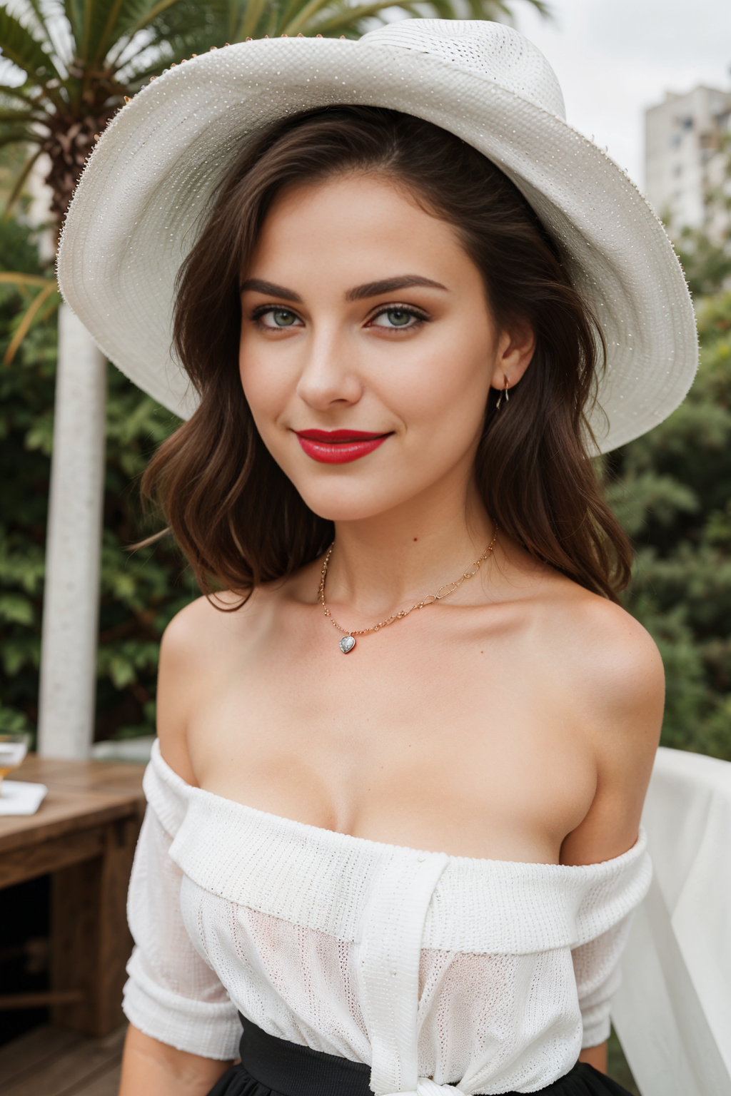 Prompt: “35 mm, 15mm, 8k, neo-expressionism, wearing a white sundress and a wide-brimmed hat, by Filip Hodas”