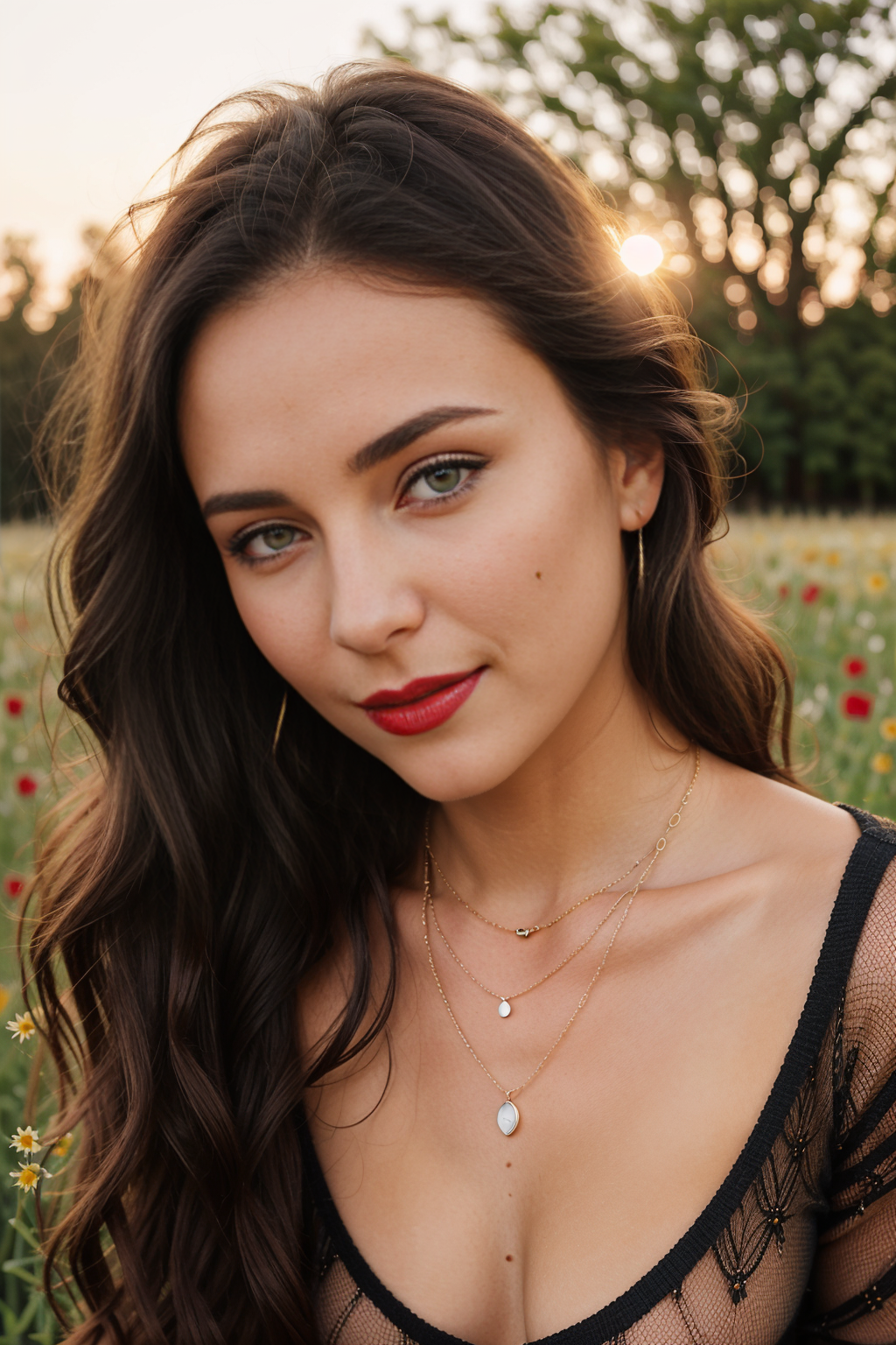 Prompt: “she is 18, 4k, 85mm, standing in a field of wildflowers with the sun setting behind her”, octane, by sarah moon”