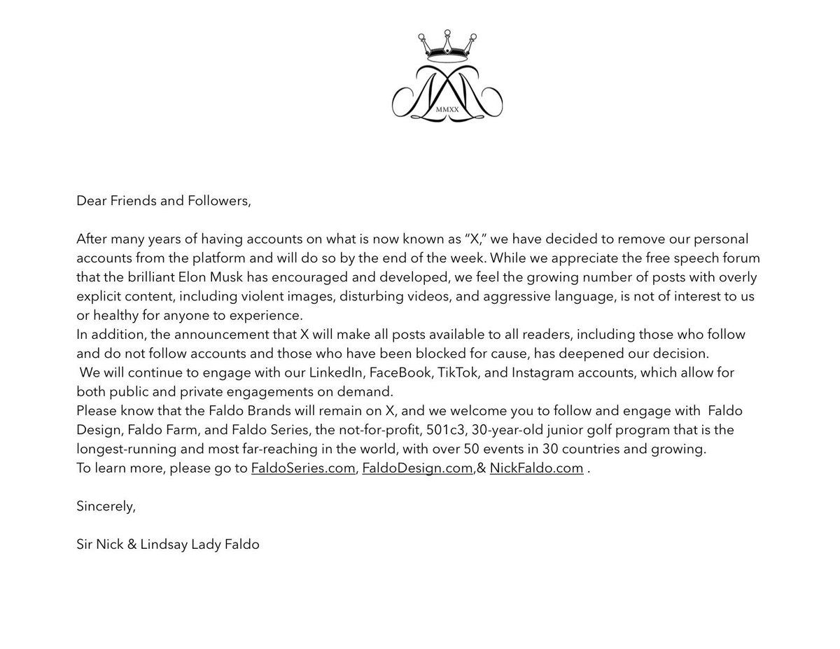 ๐จ๐ฎ๐ฑ #NEW: Sir Nick Faldo has issued a statement saying he and wife Lindsay will be leaving X, citing the platformโs content as a result of Elon Musk. Faldo says his business / brand accounts will remain active. https://t.co/Pyxosb5z2f