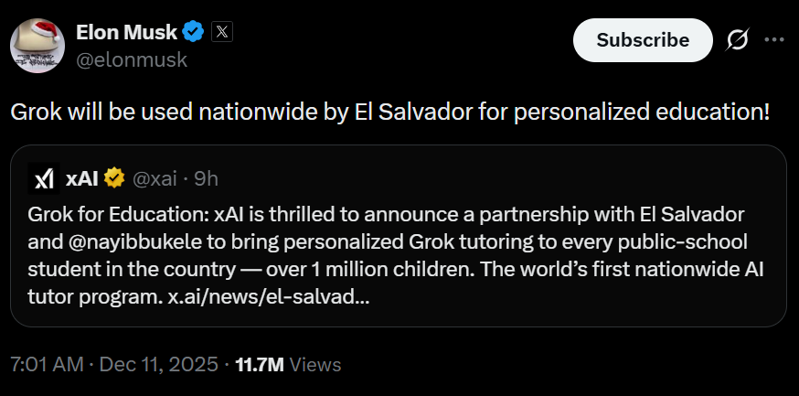 Grok will power personalized education for over 1 million students.