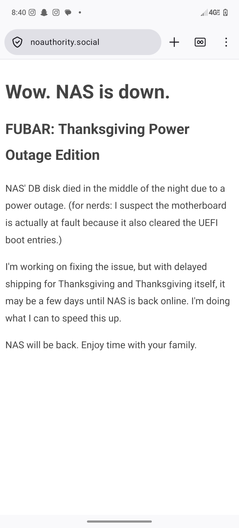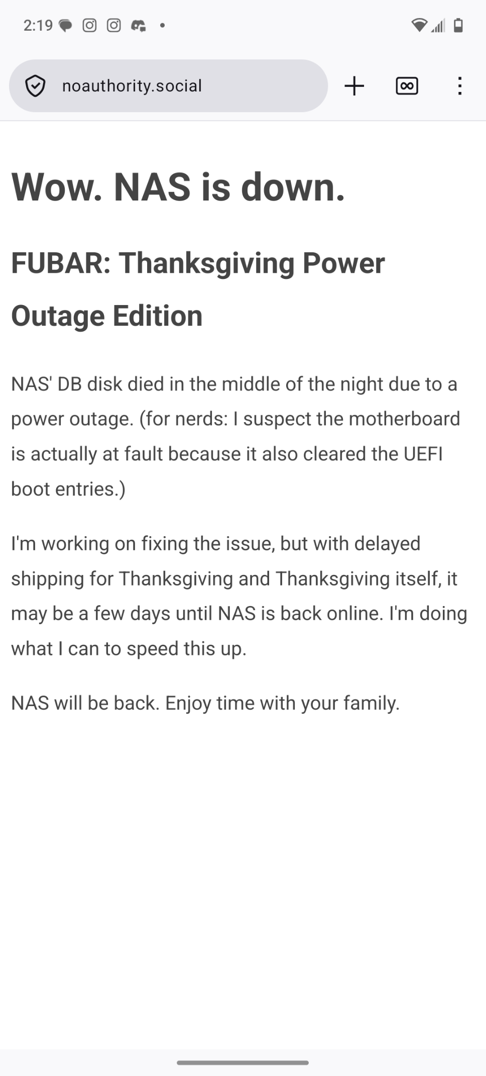 New update on the #NoAuthority outage, the hard drive has failed due in part to a power outage. Downtime is expected to last through #Thanksgiving and #BlackFriday.