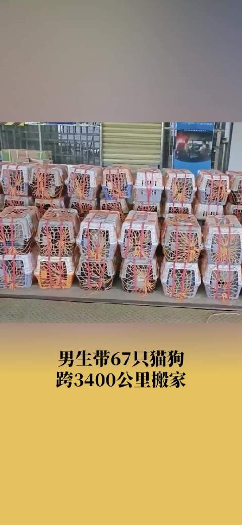 【 #男生带67只猫狗跨3400公里搬家 :一只都没有放弃】近日,辽宁丹东一男生带67只猫狗跨越3400公里搬家,引发热议。当事人廉先生介绍,花费近4万元,一共带了64只猫,3只狗。当时从海南海口回辽宁丹东,飞机先到了沈阳,后来又找了车回丹东。自己之前是开宠物店的,这些宠物一部分是自养的,一部分是被客户弃养的,还有自己收养的流浪动物。这次要回老家发展,不想让它们被二次遗弃,所以都带回来了,一只都没放弃。同时呼吁大家想清楚后再养宠物,既然养了就别遗弃,毕竟也是一条生命。(九派新闻、白鹿视频) :sys_link: https://3g.k.sohu.com/t/n716822173 :sys_video: 白鹿视频的微博视频 https://video.weibo.com/show?fid=1034:4932512045269037