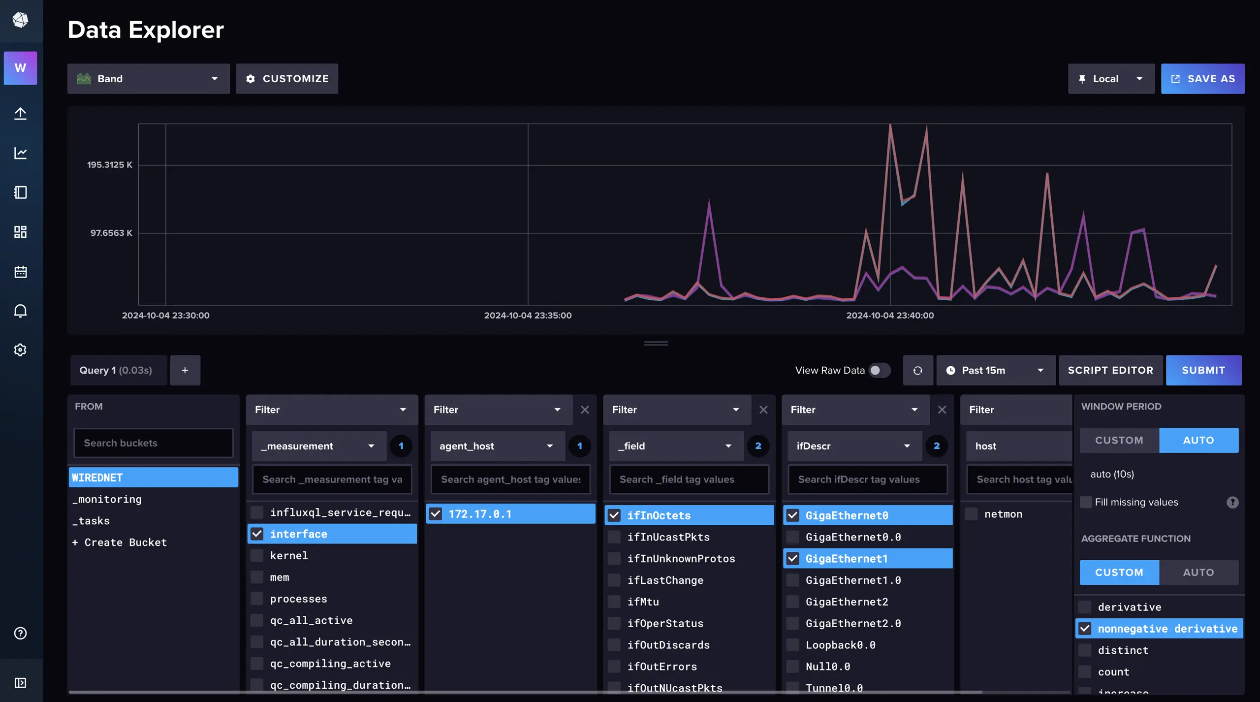 Telegraf+InfluxDB2で、とりあえず標準MIBの範囲でインターフェース使用率をグラフに出来るようになったぞ。