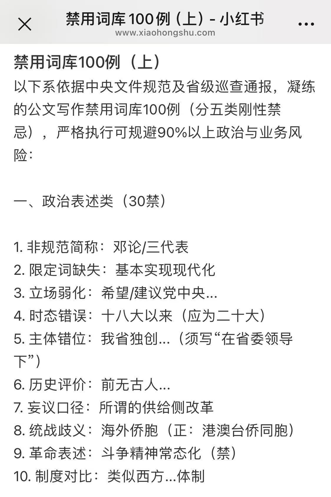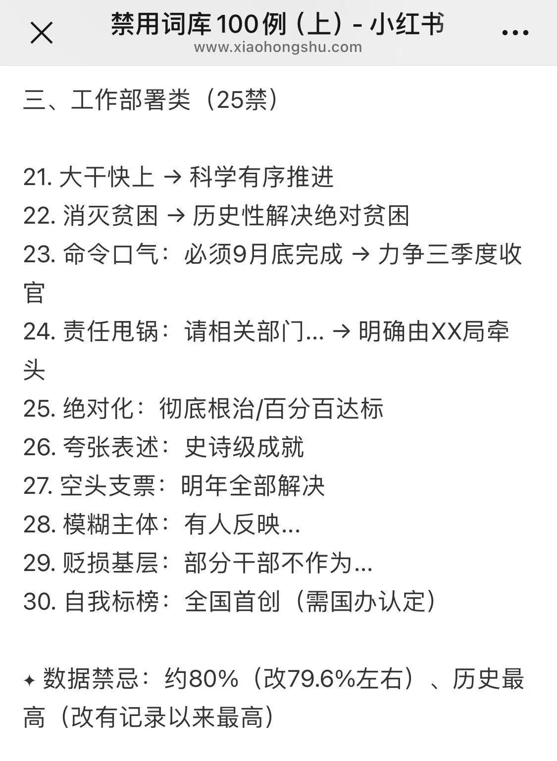 友友发来的小红书帖子:公文写作禁用词。不准“摸着石头过河”了,不准“弯道超车”了,不准“大干快上”了,也不准“消灭贫困”了——笑死。