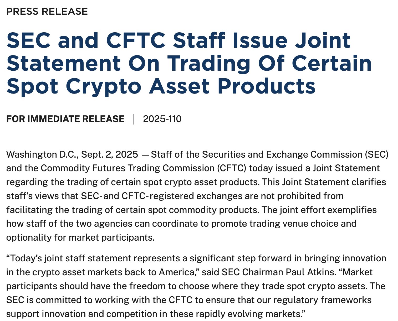 SEC and CFTC issue joint statement clarifying "registered exchanges" can facilitate trading of certain spot crypto ETFs.