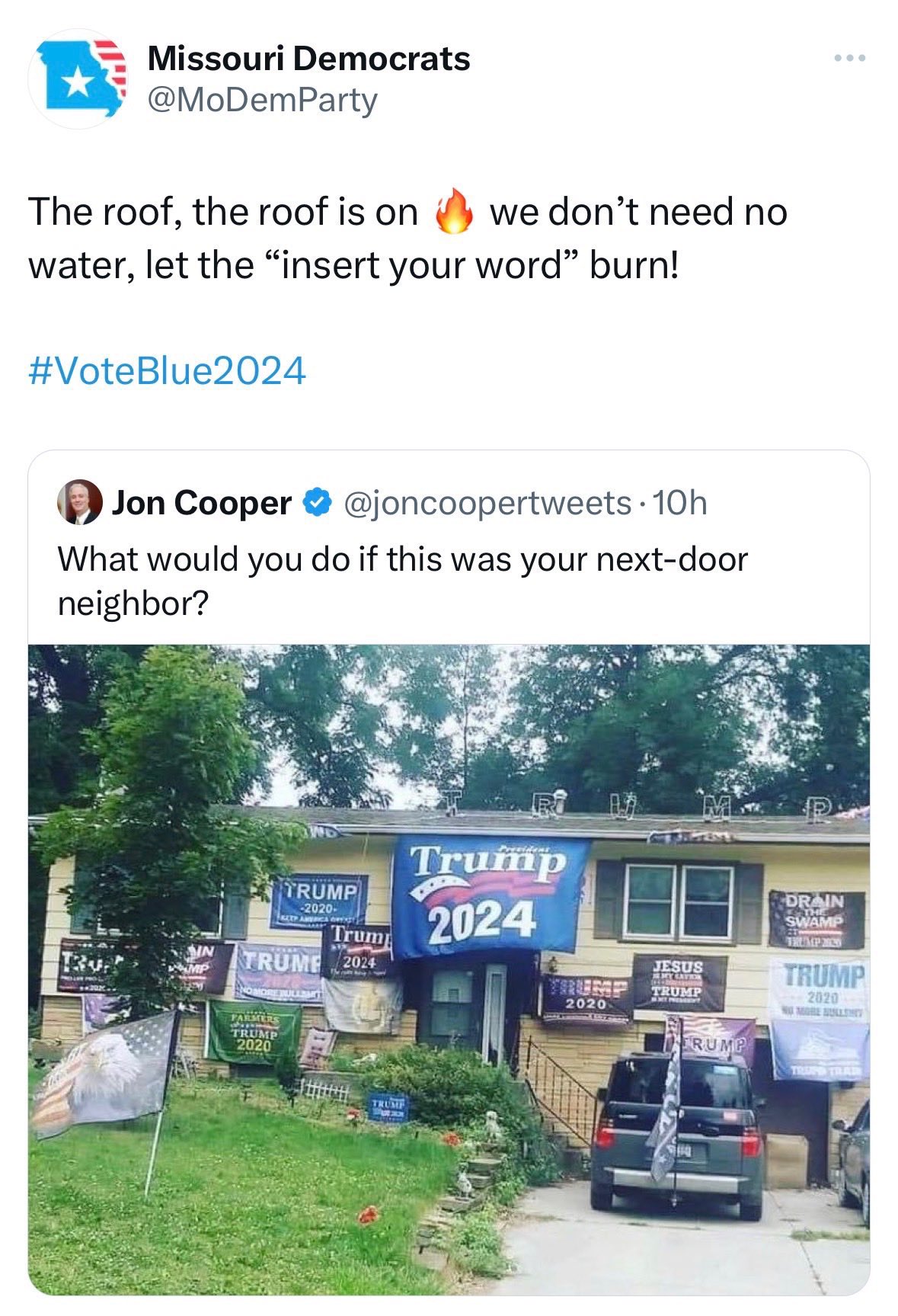 The official account of the Missouri Democratic Party expressing excitement about the possibility of a Trump supporter’s house burning down