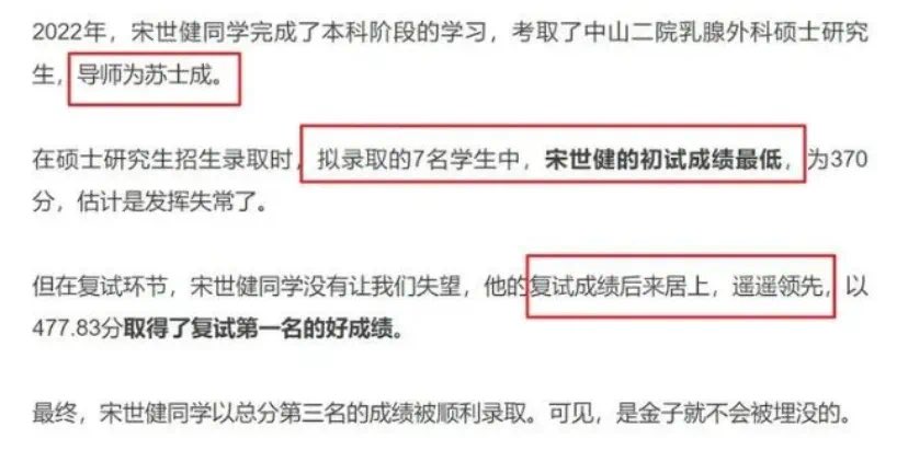 当年中山二院乳腺外硕士研究生一共录取了12名学生,宋初试成绩得分最低,370分,复试得分最高,为477.83分,总分847.83排在第五位