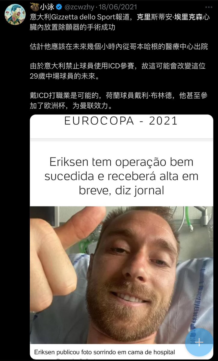 随后埃里克森接受了植入式心脏除颤器(ICD)植入手术,术后情况良好,并驰骋在2022年世界杯及近日的欧洲杯的赛场上