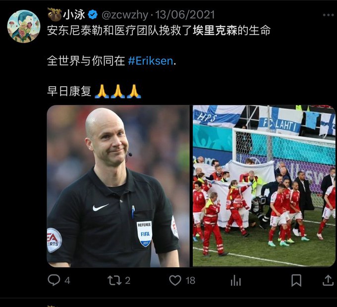 埃里克森正是2020年欧洲杯赛场上心跳骤停的球员,队医在球场奇迹般地将他从死神手中抢了回来