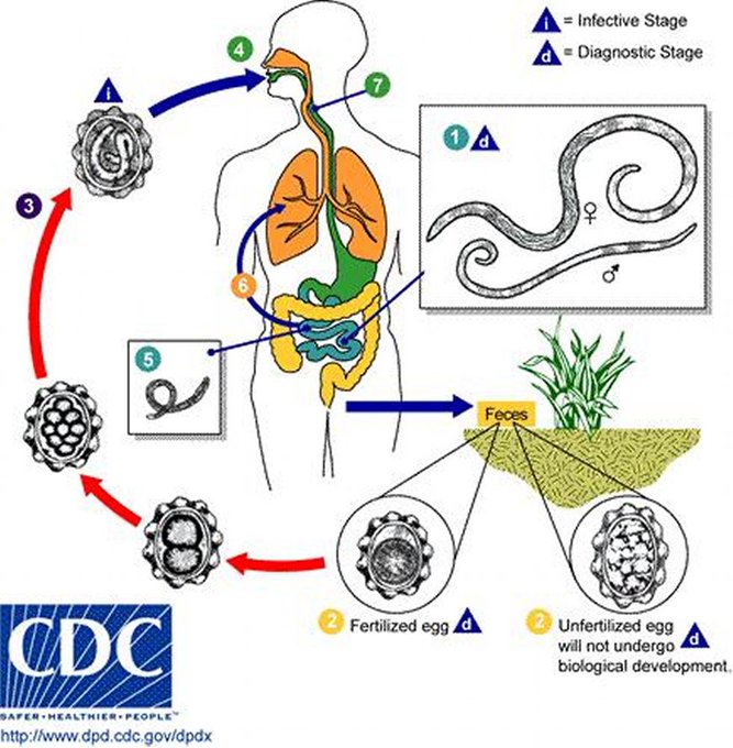 感染期卵被人吞入后大部分被胃酸杀死,仅少数进入小肠内孵出幼虫并钻入肠壁小静脉或淋巴管侵入肝,再经右心到肺,穿破毛细血管进入肺泡,经第2次和第3次蜕皮后的幼虫沿支气管、气管移行至咽,经人吞咽入消化道