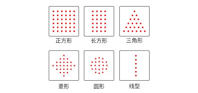 点阵激光可透过高聚焦镜发射出50μm-80μm的焦斑,并将这些焦斑扫描出多达6种的矩形图形(圆形、正方形、长方形、菱形、三角形、线形),分别适用于不同部位和不同肤质的操作