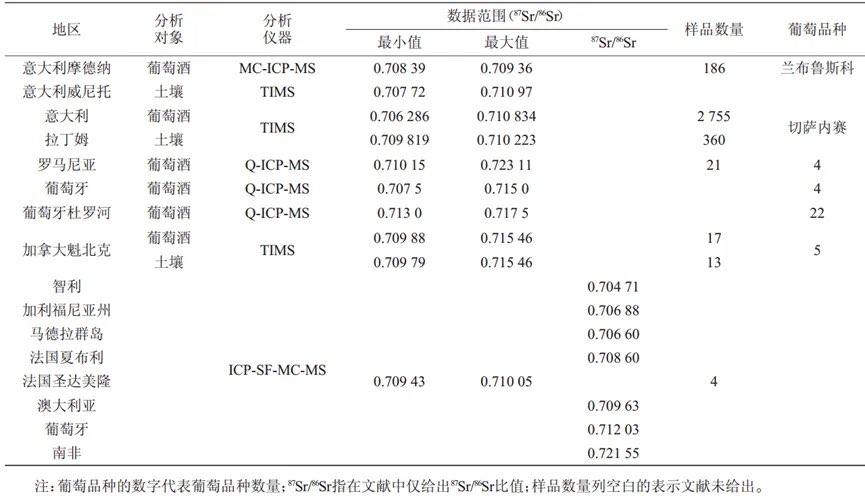 1993年,HORN P等对意大利、法国、科索沃的葡萄酒进行87Sr/86Sr测定后发现,不同地区葡萄酒的87Sr/86Sr不同,后续的研究发现不同庄园葡萄酒的87Sr/86Sr存在明显差异