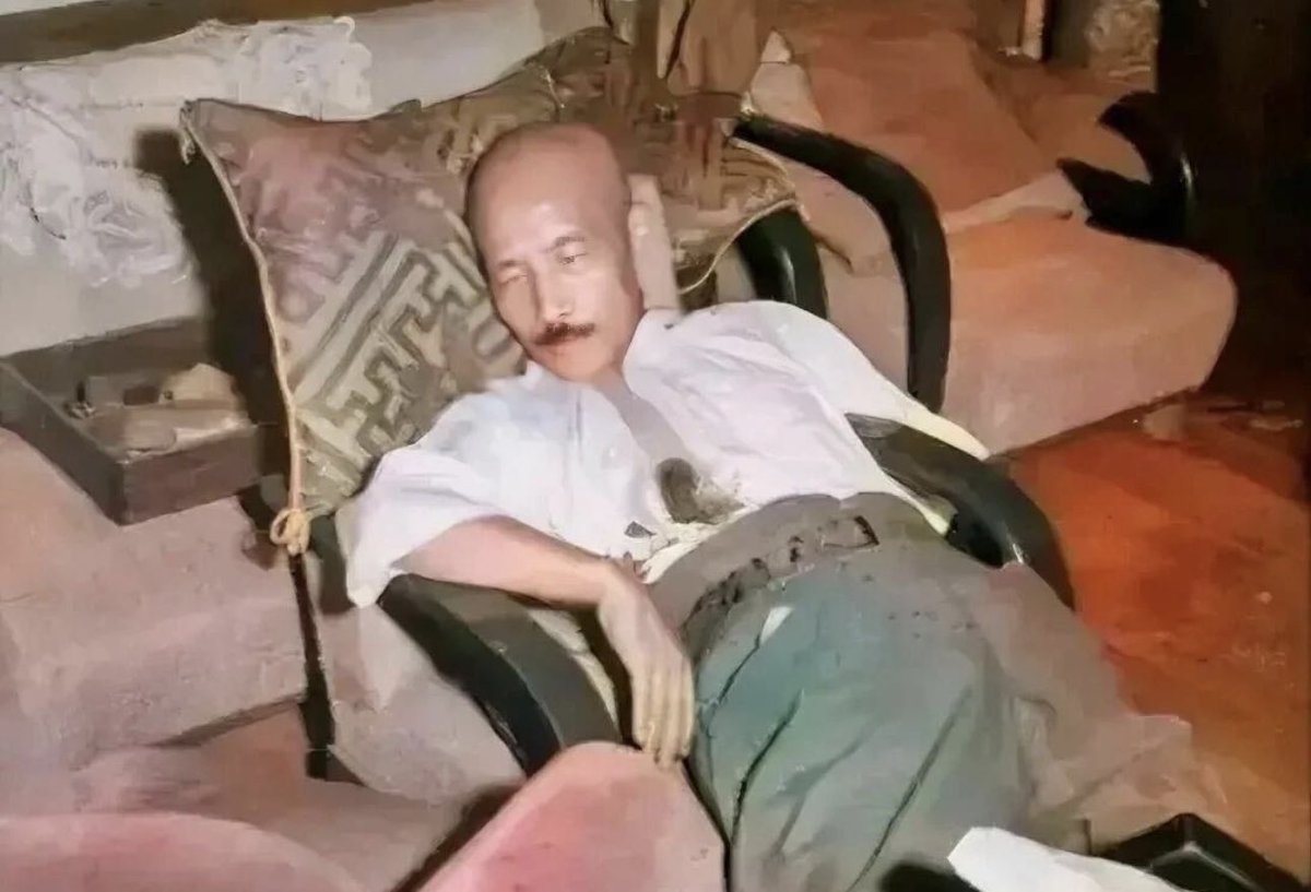 拍摄于1945年。不要以为这是一张睡觉休息的照片。照片中的日本人,叫东条英机,日本第40任首相,第二次世界大战的发动者和罪魁祸首之一,跟希特勒和墨索里尼一样臭名昭著。二战结束后,希特勒直接选择了自杀,墨索里尼被意大利游击队抓获后,次日执行了枪决。东条英机活得最久,三年后被远东军事法庭审判后,执行了绞刑。