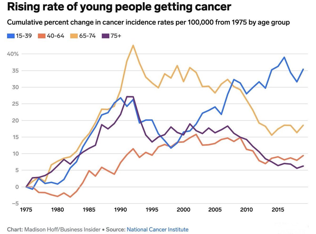 全球癌症年轻化趋势明显。英国医学杂志最近发表的研究显示,全球千禧一代被诊断患有癌症的人数稳步上升:1975年到2019年,美国40岁以下年轻人群的癌症诊断率增加35.4%,中老年人却在下降。年轻人中,发现了更多的晚期肿瘤和更具侵袭性的肿瘤,比老年患者要高得多。这个有可能和食物加工有关系?也可能和日夜颠倒有关系?也或者是年轻人的压力变成了伤害?