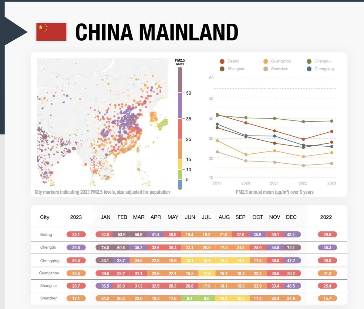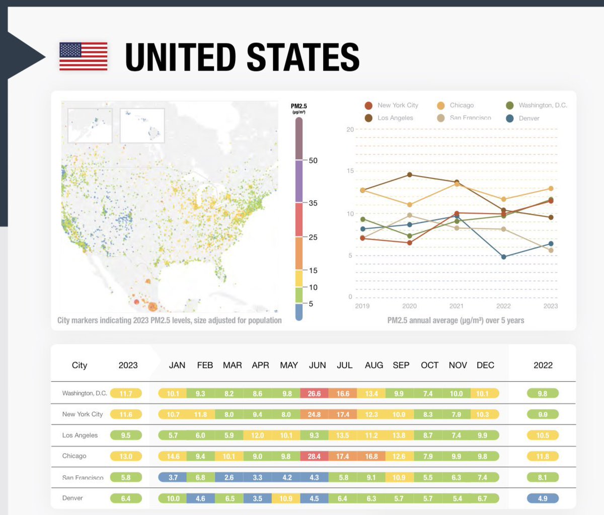 美中空气质量比较。2023年全球城市年均PM2.5浓度排名。美国大城市排行:凤凰城(13.7)、芝加哥、华盛顿、纽约、亚特兰大、休斯敦、迈阿密、洛杉矶、圣地亚哥、丹佛、圣何塞、西雅图、旧金山(5.8)。中国大城市排行:武汉(46.3)、西安、郑州、成都、北京、沈阳、南京、上海、重庆、广州、深圳(17.1)。 https://t.co/I7AcGo31AI