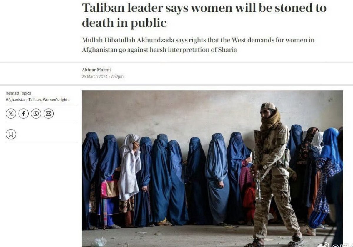 阿富汗塔利班最高领导人海巴图拉·阿洪扎达公然表态,将严惩通奸女子,以石头砸死。他们誓言继续对抗西方价值观!塔利班曾承诺走向柔和,然而现在已宣布恢复并推广公开处决、石刑、鞭刑及截取小偷四肢等酷刑,并限制女性进入健身房、浴室及美容院等等。治理无效,能力有限,还是走威权的老路。文化可以不同,但文明是趋同的。在家打老婆孩子,以内政不得干涉为由的日子一去不复返了。