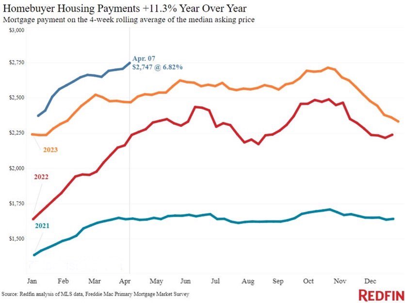 准备在美国买房的,可继续观望几个月了。突发消息:2024年4月,美国每月抵押贷款中位数创下2,747美元/月的新高。这比2023年增长11%,比2022年同期增长22%。自2021年以来,每月抵押贷款中位数大幅上涨了69%。如果将保险、维护和税收等其他房屋所有权成本考虑在内,平均每月还款额将超过3,000美元。与此同时,房屋售价中值为378,250美元,仅比2022年6月的最高纪录低约5,000美元。住房负担能力正在变得越来越糟糕。