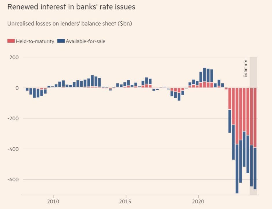 美国的各大银行在走钢丝?今年持有至到期资产的未实现损失,接近4000亿美元。人们认为这不会成为问题,因为美联储今年会大幅降息,但如果没有降息怎么办?U.S. Banks finished the year with almost $400 billion of unrealized losses on held-to-maturity assets. The assumption is this wouldn't be a problem because the Fed would cut A LOT this year but what if that doesn't happen?