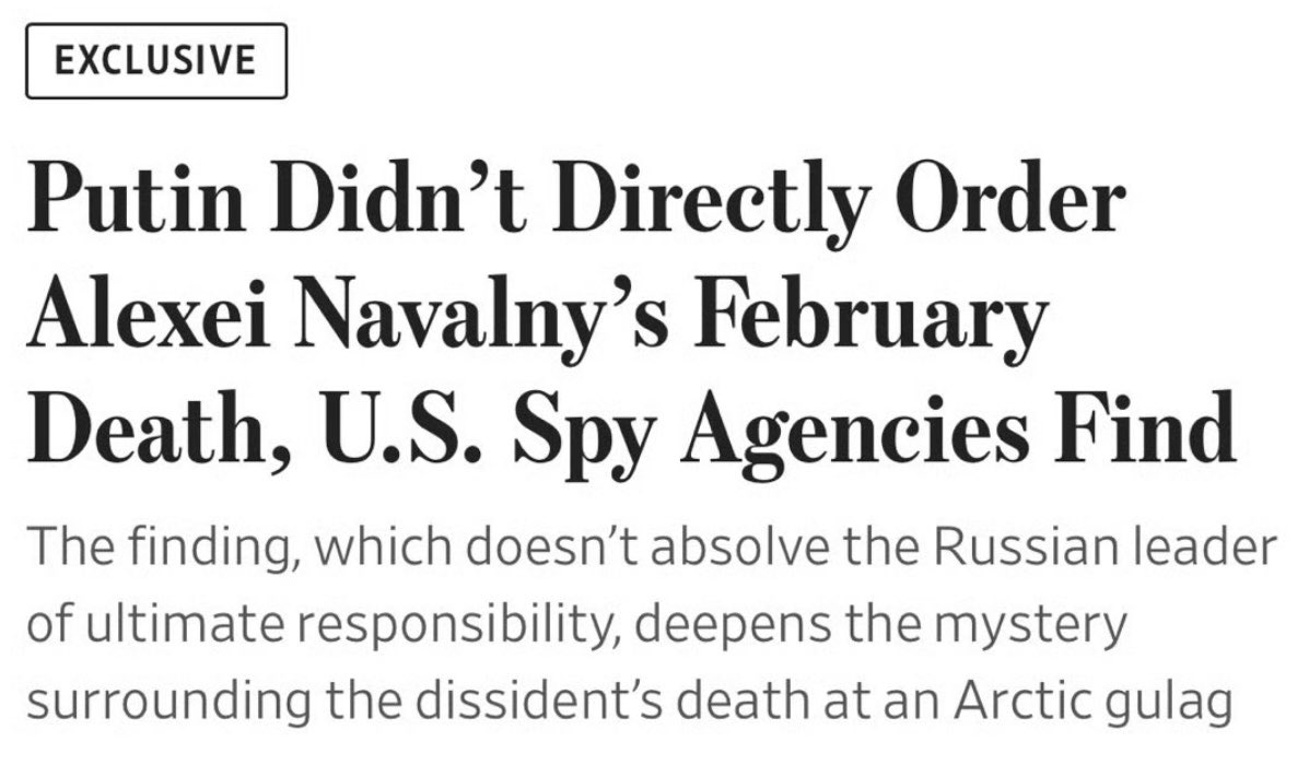 美国情报机构发现,普京并未直接下令在二月份杀害阿列克谢·纳瓦尔尼。这一发现并不能免除俄罗斯领导人的最终责任,但却加深了这位异见人士在北极古拉格集中营死亡的谜团。Putin Didn't Directly Order Alexei Navalny's February Death, U.S. Spy Agencies Find The finding, which doesn't absolve the Russian leader of ultimate responsibility, deepens the mystery surrounding the dissident's death at an Arctic gulag.