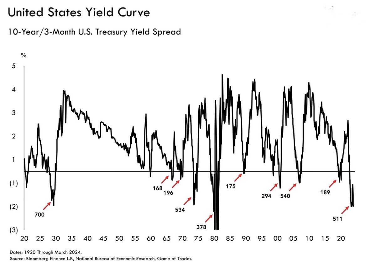美国可能衰退?人们现在已经忘记了经济衰退,但这并不意味着它不会到来。这张图表显示了自1920年以来,倒挂与衰退之间的时间差。如今,美国已经连续511天处于衰退期,因此2024年下半年出现衰退的可能性仍然很大。系好安全带。People have now forgotten about a recession. But that doesn’t mean it’s not coming. This chart shows the time lag between an inversion and a recession since 1920. Today, we’re at +511 days, making a H2 2024 recession still very likely.