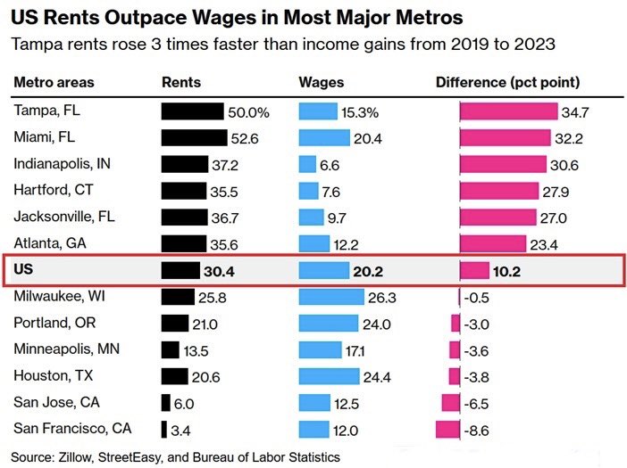美国住房负担能力,已变得有多糟糕?过去4年,美国房租上涨速度是家庭收入上涨速度的1.5倍。从2019年到2023年,全国租金上涨约30%,而平均工资仅上涨20%。美国前50个大都市区中,除6个以外,其余地区的租金成本涨幅都超过了工资涨幅。在坦帕和迈阿密,过去四年间租金上涨速度是工资上涨速度的三倍多。与此同时,美国的平均租金接近创纪录的每月2,100美元。住房负担能力持续恶化。