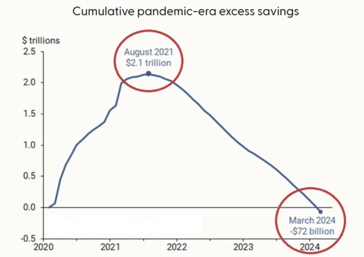 美国人,钱花光了?令人震惊的数据:自2021年8月以来,美国经济已损失了2.1万亿美元的过剩储蓄。从2020年3月到2021年8月,4万亿美元的刺激计划之后积累了2.1万亿美元的超额储蓄。自那时起,美国家庭以每月约700亿美元的速度消耗这些储蓄,到2024年3月则降至-720亿美元。与此同时,美国信用卡债务增加了3300亿美元,达到创纪录的1.1万亿美元。与此同时,美国储蓄利率从2月份的3.5%下降至3月份的3.2%,为2022年11月以来的最低水平。储蓄如今被认为是一种奢侈。