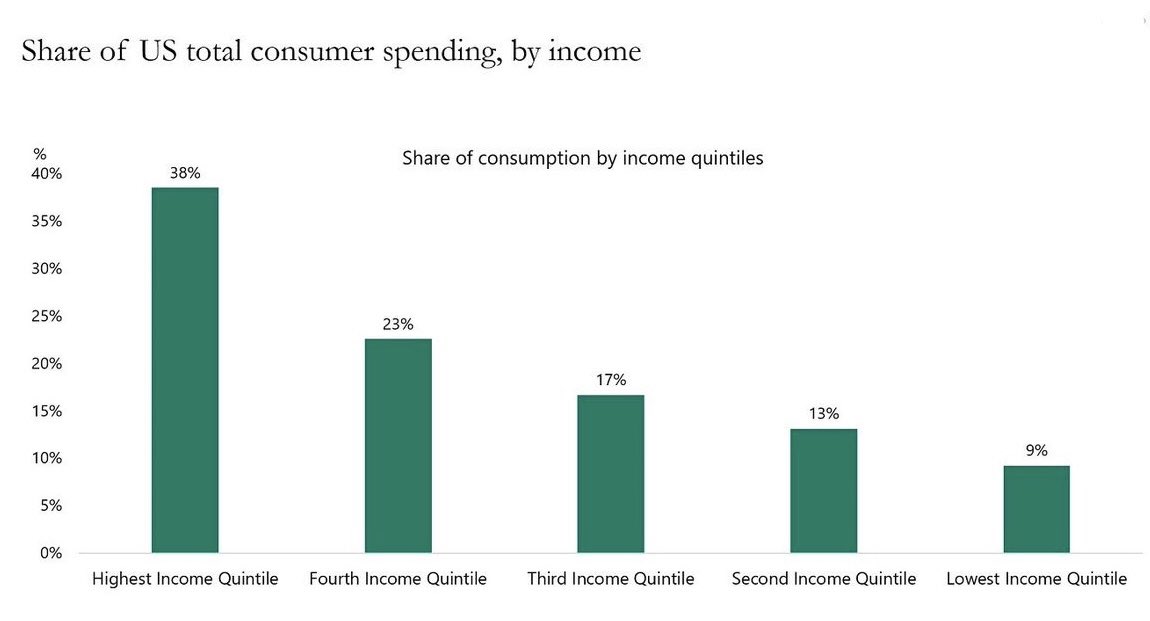 目前,收入最高的20%的人,占据了美国消费者支出的40%。与此同时,底层20%的消费者目前仅占消费支出的9%。即使将美国收入最低的40%合并起来,他们也只占消费支出的22%,而收入最高的40%则占61%。通胀率连续37个月超过3%,贫富差距进一步扩大。收入较高的人群,通过房地产和股票,跑赢了通货膨胀。其他人,都被抛在后面了。