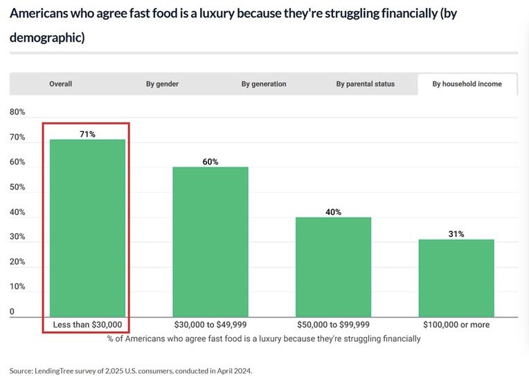 这令人担忧:一项调查显示,78%的美国消费者认为快餐因价格昂贵而是一种奢侈品。75%的美国人每周至少吃一次快餐,但62%的人声称价格上涨限制了他们减少吃快餐的次数。50%的受访者认为快餐是一种奢侈品,因为他们经济拮据。这种现象在年收入低于30,000美元的家庭中最为明显。与此同时,一顿家庭快餐目前要花费60至70美元。快餐价格发生了什么变化?