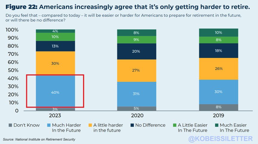 退休正在成为一种奢侈吗?40%的美国人声称退休变得更加困难,这一比例从2019年(30%),和2020年(31%)跃升。此外,30%的受访者表示退休有点困难,高于2019年(26%)和2020年(27%)。人们指出,高通胀以及退休和长期护理医疗费用的上涨是导致退休变得更加困难的主要因素。有趣的是,42%的美国人表示,股市波动性加大,是他们对退休生活不太放心的一个主要原因。