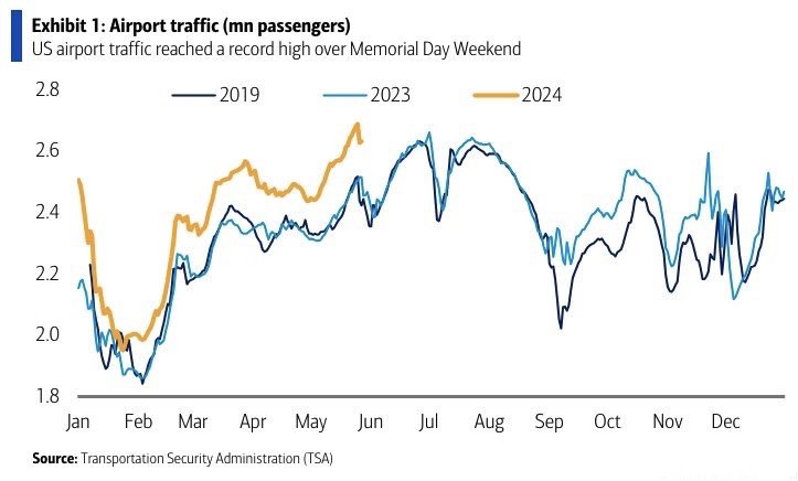 上周末,美国机场TSA检查站通过旅客数量创历史新高。截至5月25日星期六的一周内,平均每天有269万人次从美国机场起飞。这是创纪录的航空运输量,比2019年和2023年同期的数字高出近7%。All-Time High Number of Passengers Passed Through TSA Checkpoints at US Airports Last Weekend. An average of 2.69mn people per day flew out of US airports in the week ending Saturday, May 25. This was a record level of air traffic.
