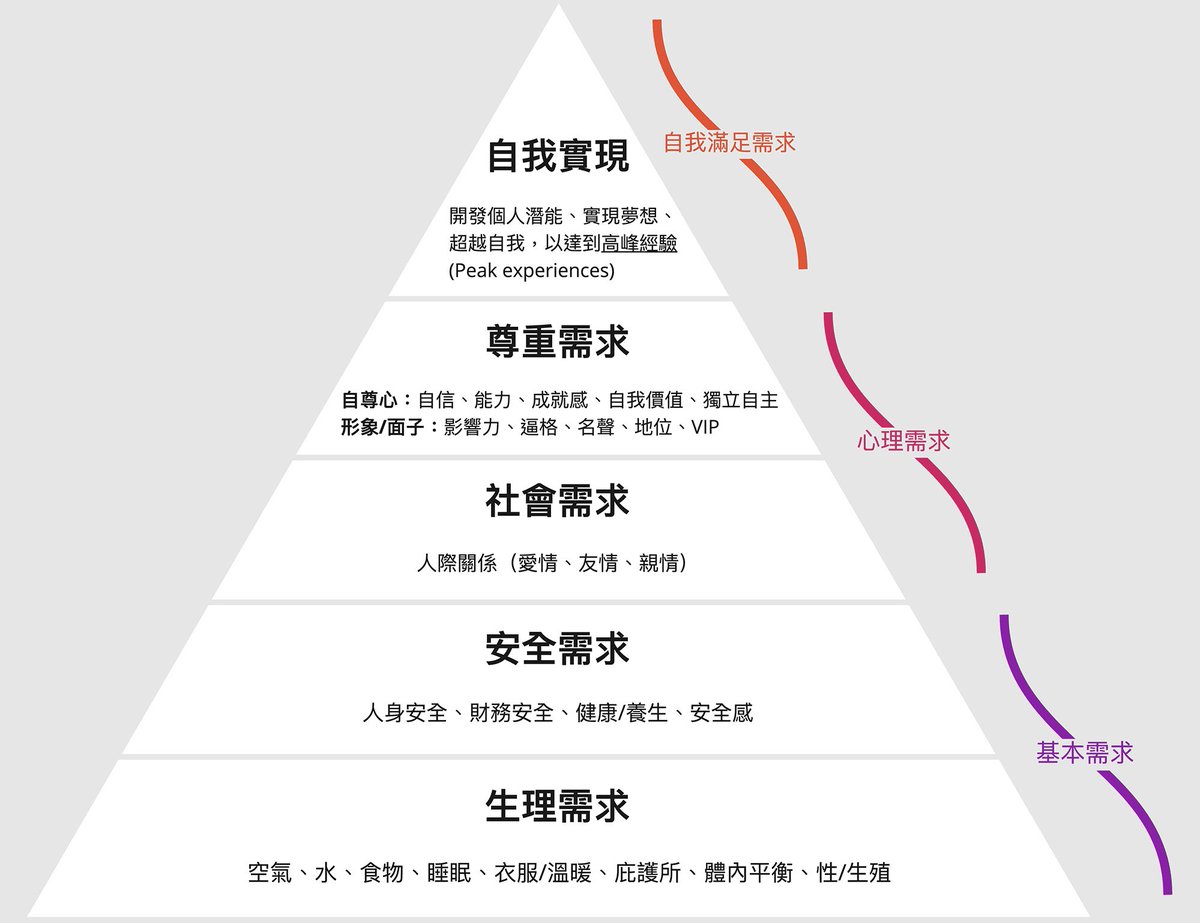 自我实现需求(Self-actualization needs):开发个人潜能、实现梦想、超越自我、以达到高峰经验。
