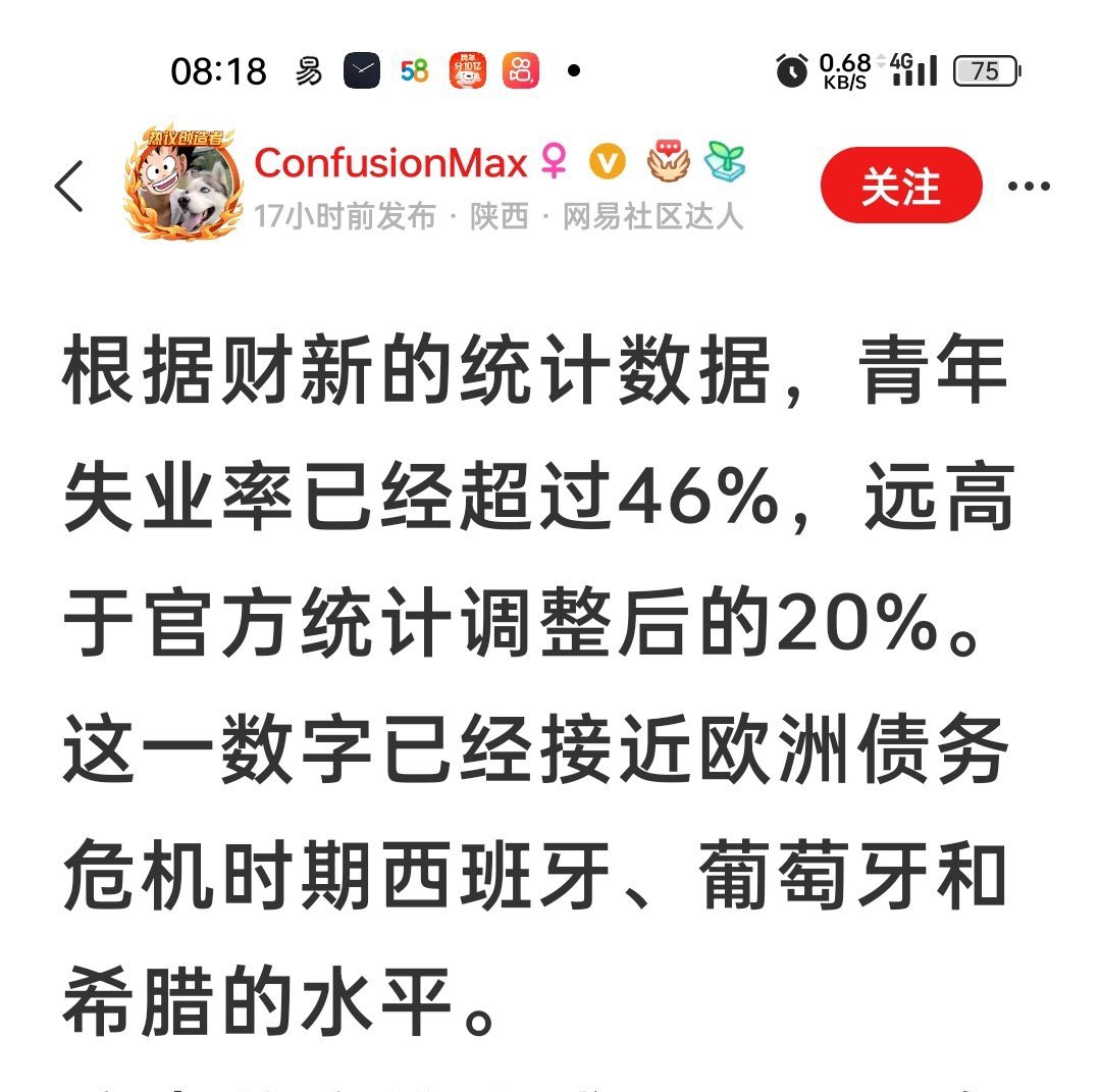 根据财新的统计数据,青年失业率已经超过46%,远高于官方统计调整后的20% https://t.co/LgpyLfE8OC