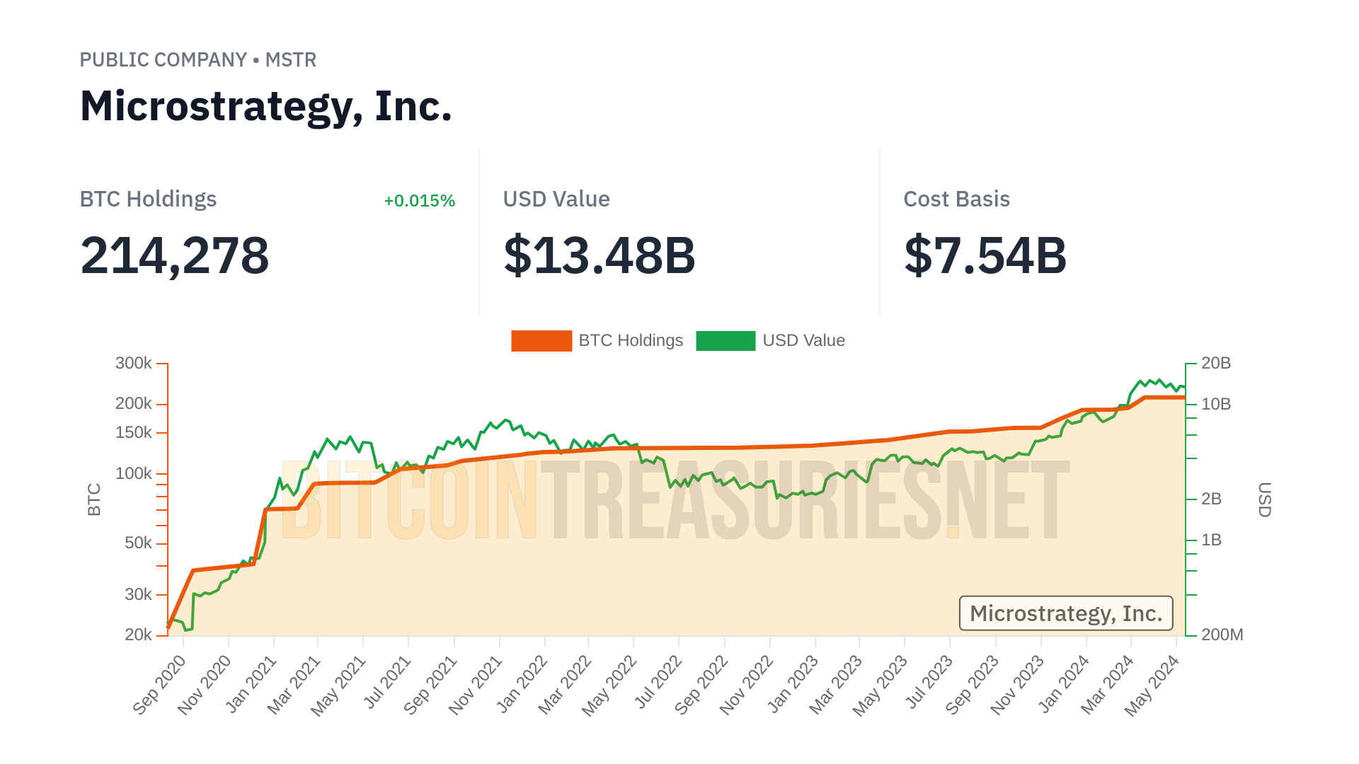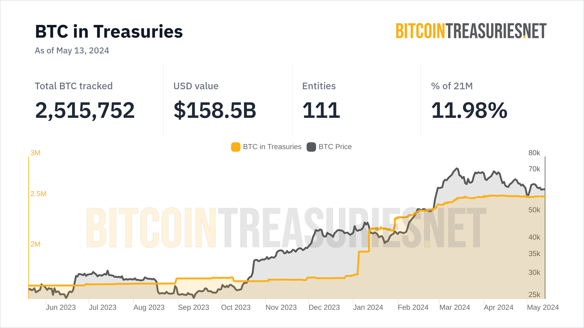 Summary of BitcoinTreasuries.NET data as of May 13, 2024: