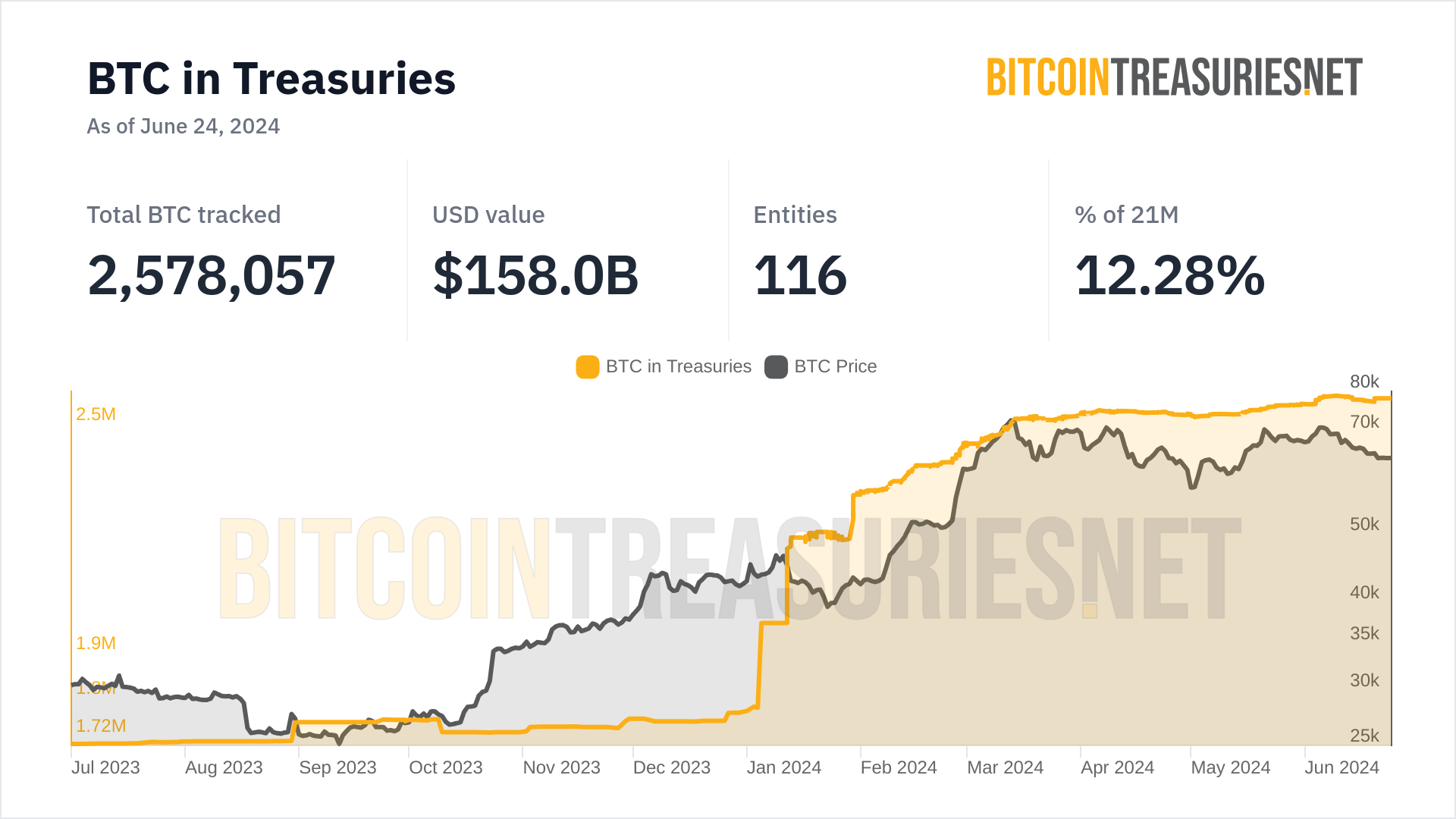 Summary of BitcoinTreasuries.NET data as of June 24, 2024: