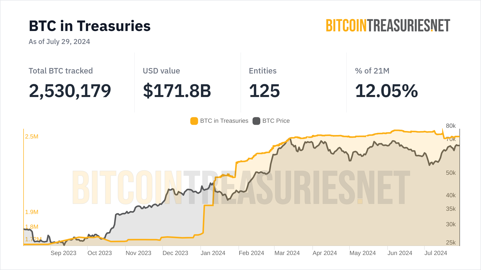 Summary of BitcoinTreasuries.NET data as of July 29, 2024:
