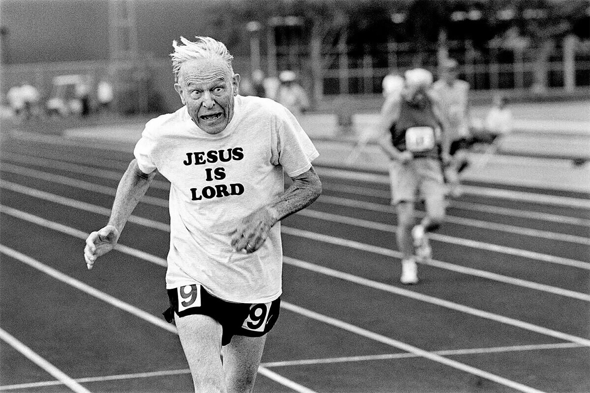 A sprinter crosses the finish line during a track event during the Senior Olympics in Baton Rouge, Louisiana, 2001 - by Ed Kashi (1957), American