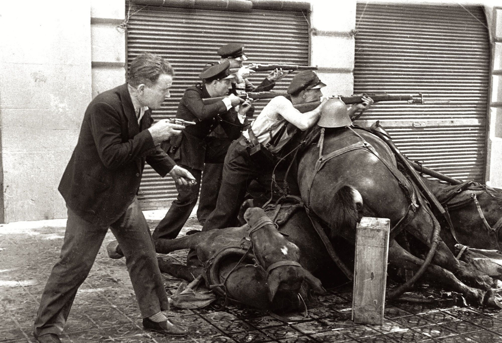 Spanish Civil War, 1936/1939: an assault guard takes cover behind dead horses in Barcelona, July 19, 1936 - by Agusti Centelles (1909 - 1985), Spanish