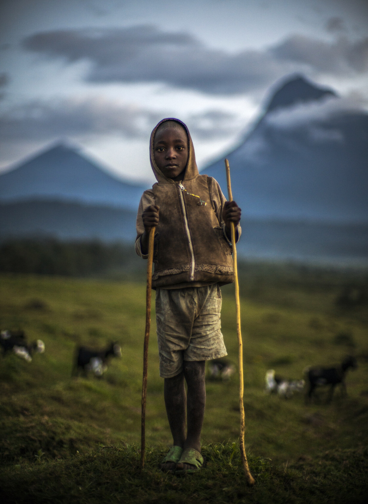 A young goat herder tends to his goats in the foreground of Mount Mikeno; a volcano located in the Virunga Mountains, Congo, 2018 - by Michael Christopher Brown (1978), American