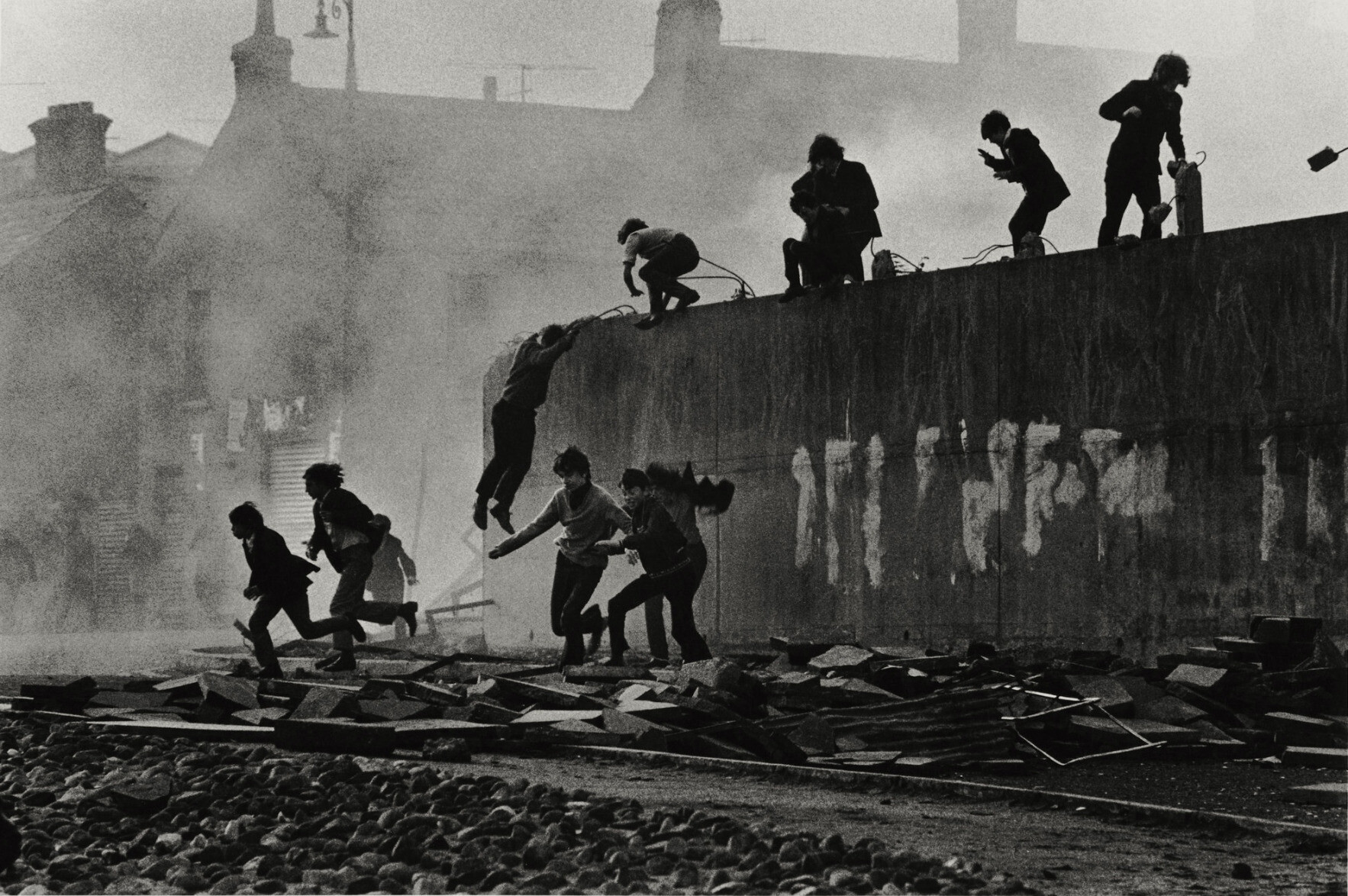 Catholic youth escaping a CS gas assault in the Bogside, Londonderry, Northern Ireland, 1971 - by Don McCullin (1935), English